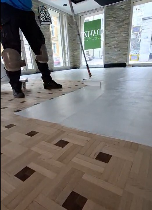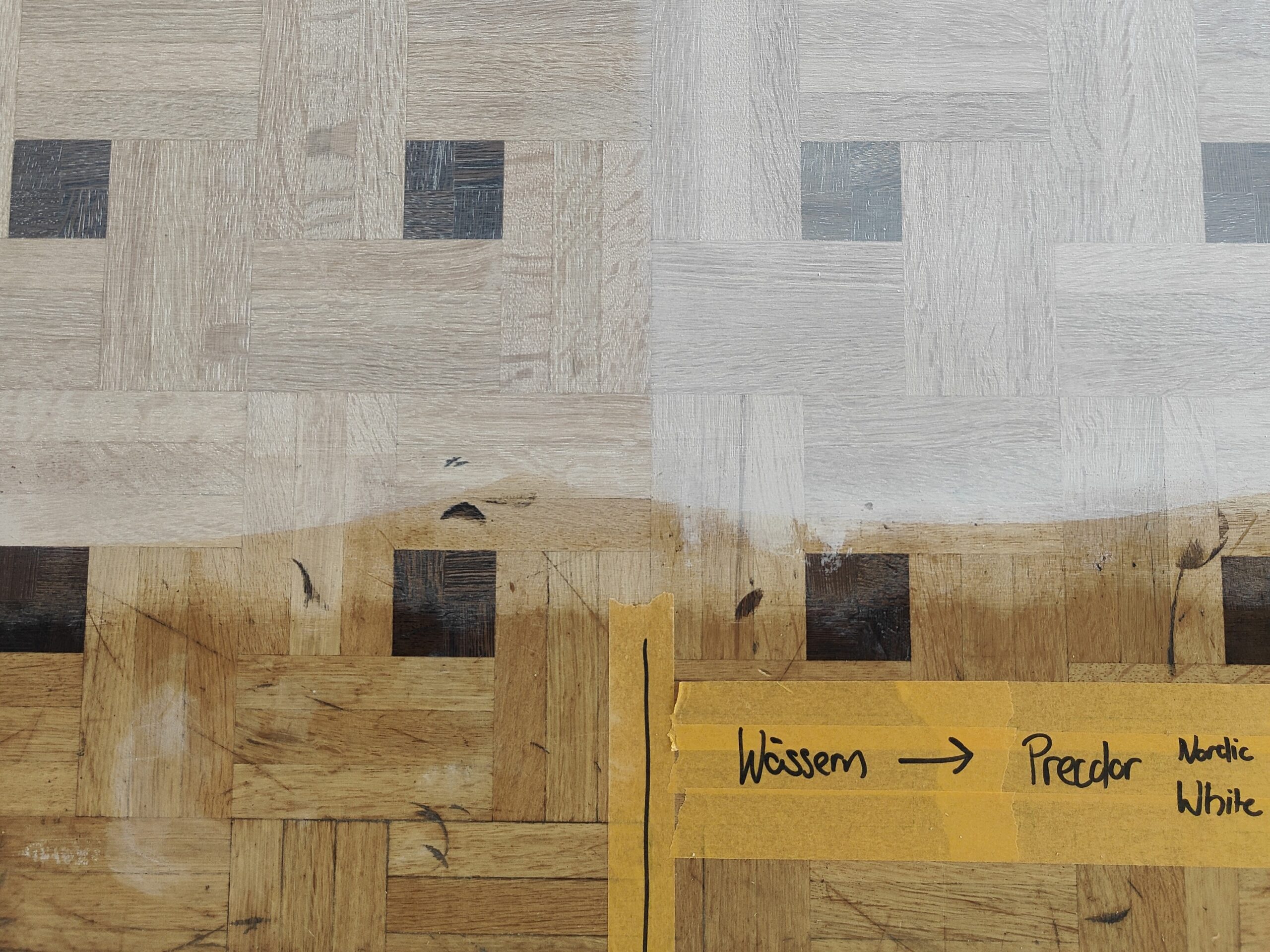 “Die Bauherrschaft hatte einen ganz klaren, fast unlösbaren Wunsch: Aus dem massiven Eiche-Mosaikboden sollte ein Shabby-Chic-Traum werden – nichts von der Stange. Ich habe verschiedene Farben getestet, Schleiftechniken ausprobiert und viel experimentiert, bis der Boden seinen Shabby-Chic-Charakter zeigte. Es macht einfach Freude, wenn aus einem bestehenden Boden etwas völlig Neues entsteht.